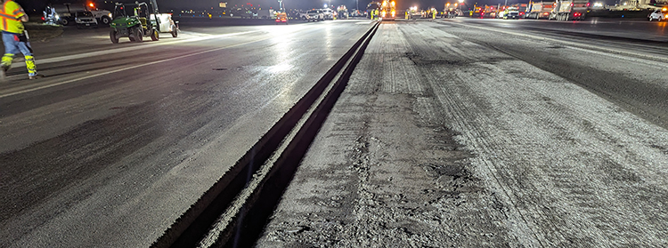 A straight PG 64-22 was used for the tack coat, as opposed to an emulsified tack product, which allowed paving to proceed without waiting for the tack to break. A uniform tack coat application was essential for bonding the new lifts, even lifts placed on top of each other the same night. The detailed design plans called for transverse and longitudinal joints to be offset between lifts, mitigating crack propagation.