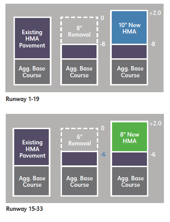 The final design called for an 8-inch asphalt removal (sometimes 6-inch on Runway 15-33, depending on depth of deterioration) and a multi-lift replacement with high-performance asphalt. Overall, each runway’s total thickness was increased by two inches to accommodate heavier aircraft in the future.