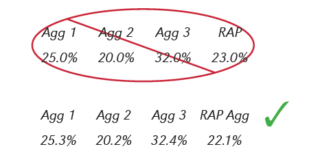 The RAPaggregate percentage from the cold feed bin is always lower than the percentage of the RAPcoldfeed.