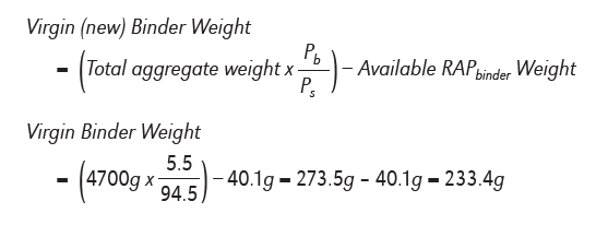 Therefore, out of the 230 lbs. of RAP from the cold feed bin in this example, (21.9% x 1000 lbs.) 219 lbs. is RAPaggregate. Subtract the weight of the RAP aggregate from the total RAP weight to get the RAPbinder weight of 11 lbs.